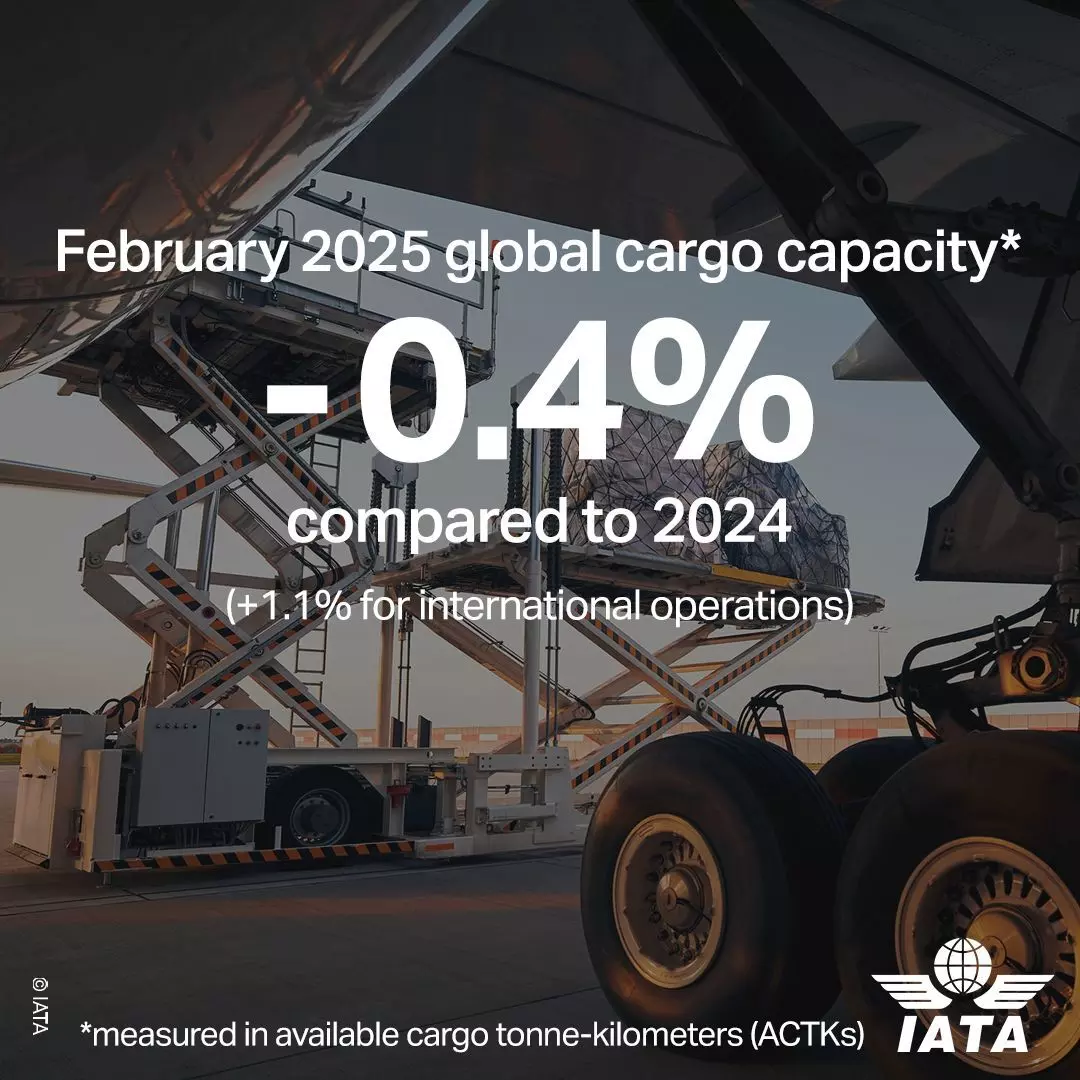 "Capacity, measured in available cargo tonne-kilometers (ACTKs), decreased by 0.4 percent compared to February 2024 (+1.1 percent for international operations)."