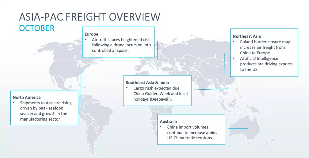 Summarising the current air freight market, Kathy Liu, VP, Global Sales and Marketing, Dimerco Express Group, mentioned, “From September to November marks the peak season for air freight, and this year, demand growth is particularly strong in Southeast Asia, including Thailand, Vietnam, Malaysia, and Singapore. Rising production of high-tech goods, AI components, and semiconductors in these countries is driving increased shipments,” but warned, “Geopolitical unrest in regions such as Thailand, Indonesia, the Philippines, Nepal, Japan, the US, and across Europe may disrupt supply chains through protests, regulatory shifts, and unstable governments.”