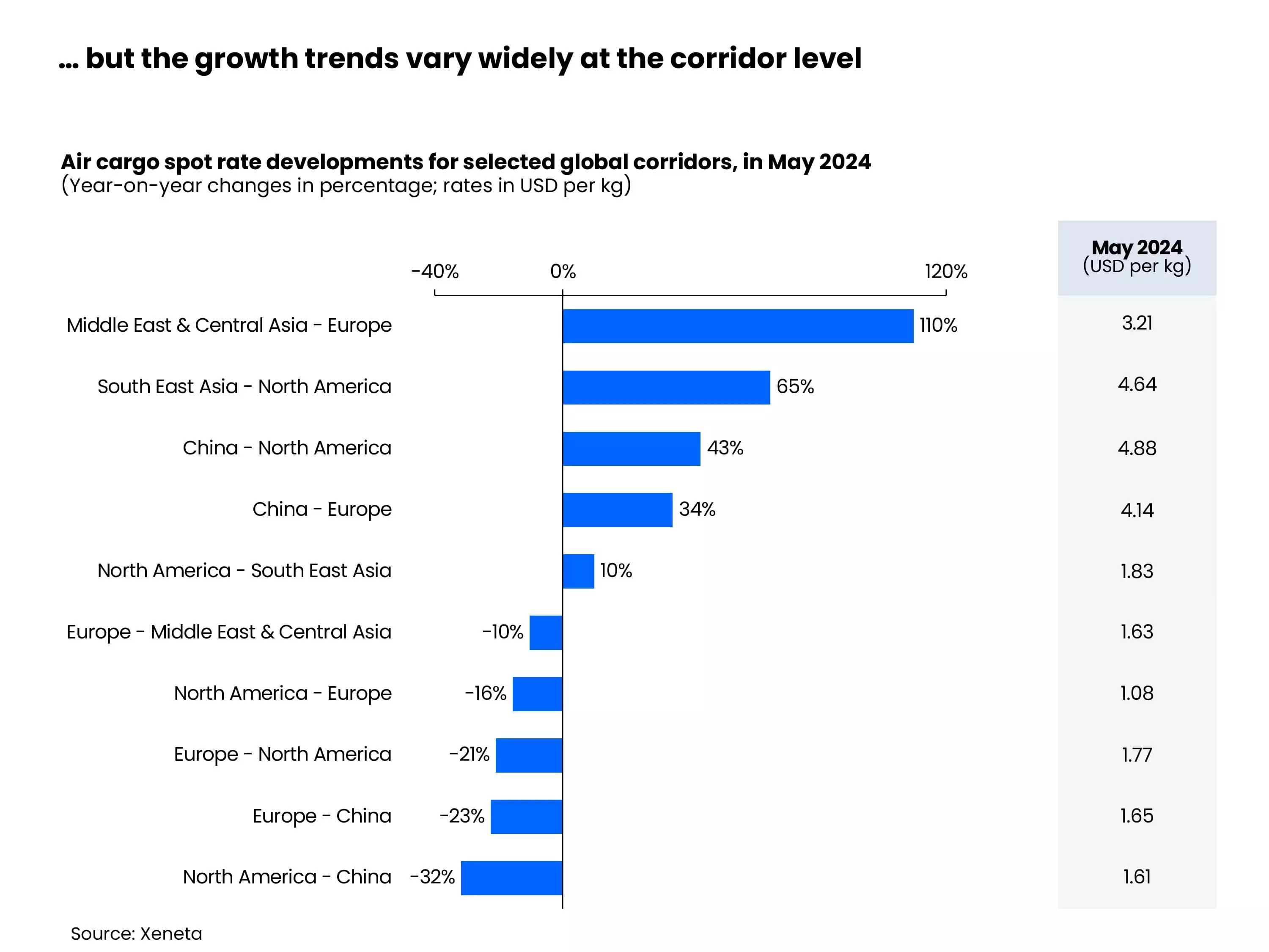 The highest year-on-year rate increase for May was the 110 percent rise in spot rate on the Middle East & Central Asia to Europe corridor to $3.21 per kg due to continuing Red Sea disruption, the update added. "Southeast Asia and China to North America spot rates rose 65 percent and 43 percent to $4.64 per kg and $4.88 per kg, respectively. China-Europe spot rate also recorded double-digit growth, up 34 percent year-on-year, to $4.14 per kg."