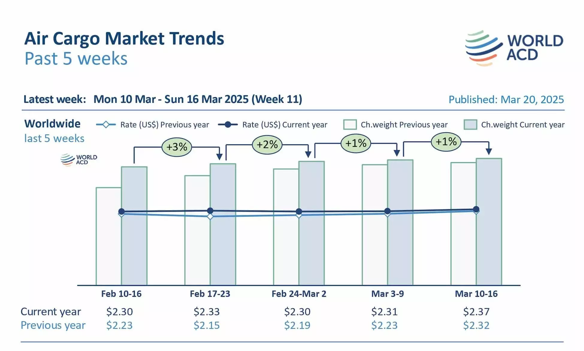 Average worldwide rates of $2.37 per kilo, based on a mix of spot prices and contract rates, rose three percent WoW in week 11, taking them two percent above their equivalent level this time last year, the update added.