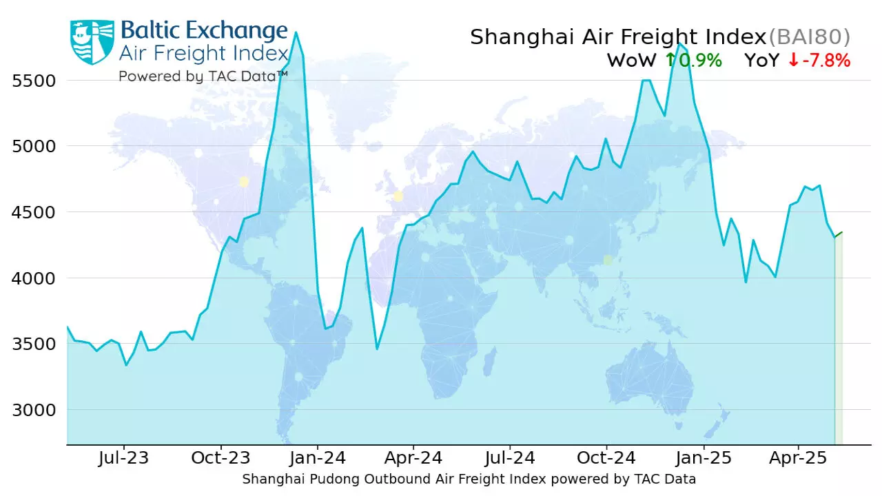 "The global Baltic Air Freight Index calculated by TAC gained +1.5 percent in the week to May 12, leaving it not that far below where it was 12 months ago at -3.6 percent year-on-year," according to the weekly update.