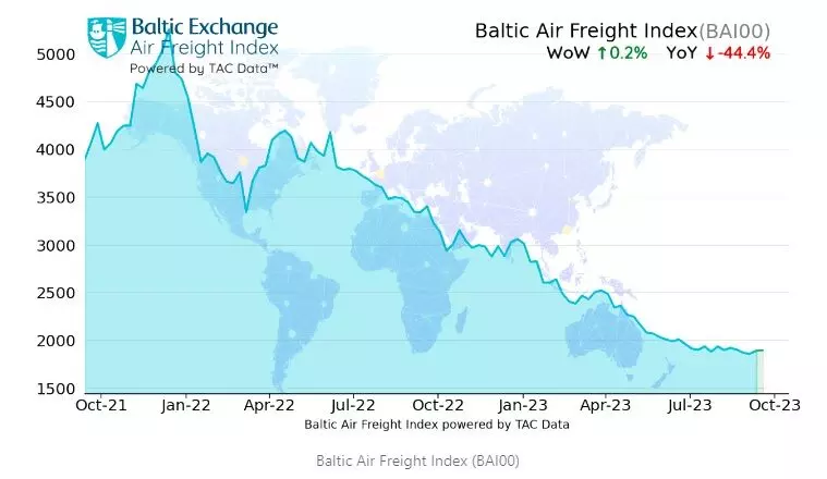 Air freight rates were slightly higher again last week, according to the latest data from TAC Index. The overall Baltic Air Freight Index (BAI00) edged up marginally (0.2 percent) in the week to September 18, leaving the year-on-year change at -44.4 percent.