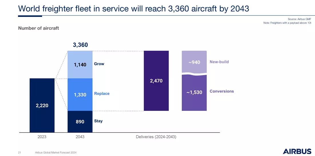 Airbus anticipates that 2,470 freighters will enter the industry over the next twenty years, comprising 940 new-builds and 1,530 conversions, down from its earlier projection of 2,510 freighters.