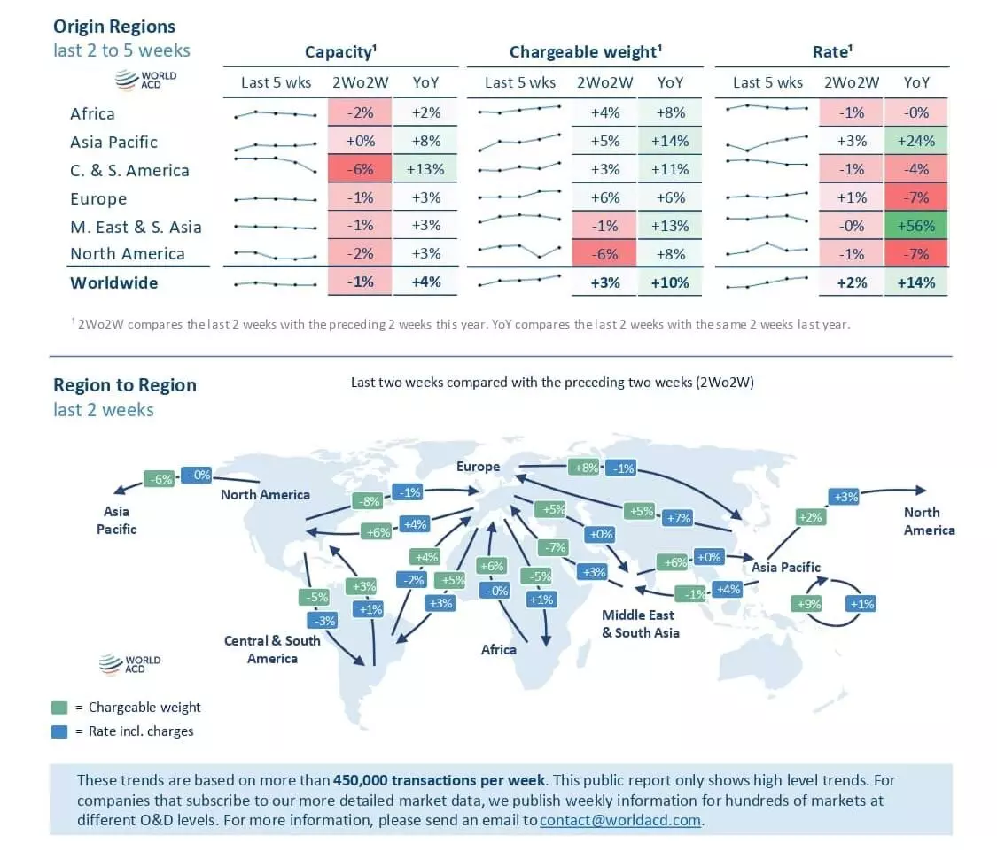 Worldwide air cargo tonnages flown increased by four percent in week 37 (September 9-15), week on week, driven by a five percent increase from Asia Pacific origins, a six percent increase from Central & South America (CSA), and a rebound of 10 percent from North America origins, the update added.