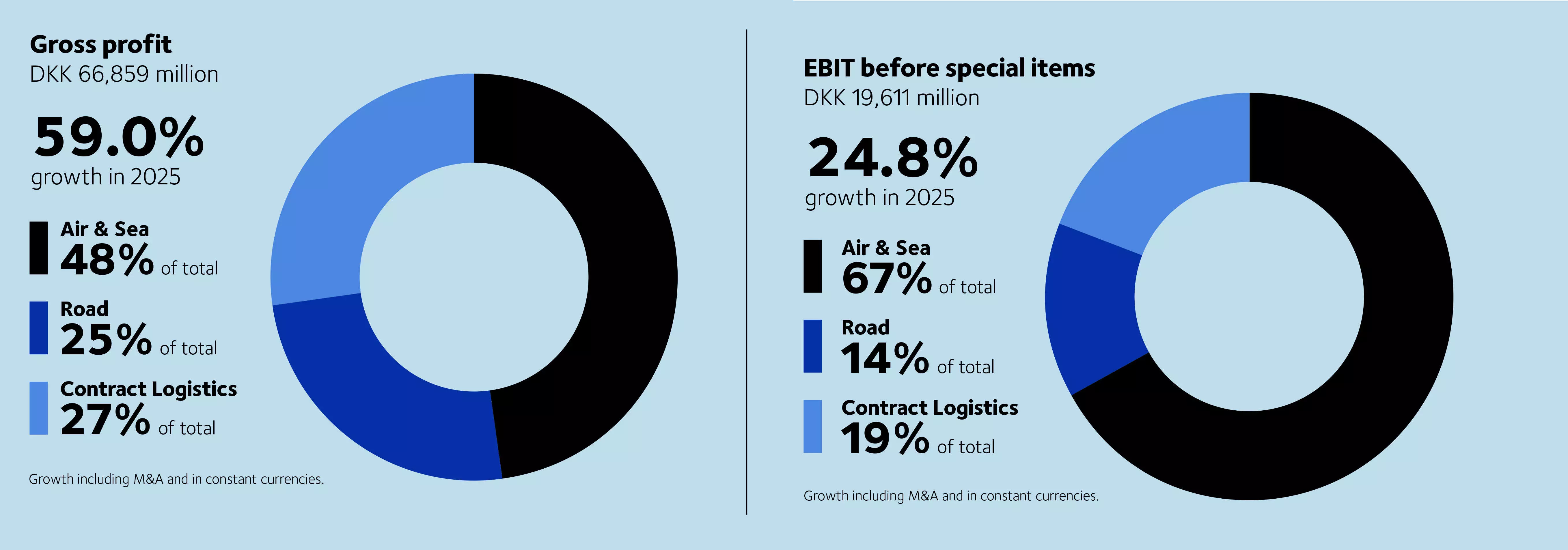 At the group level, DSV delivered full‑year revenue of DKK 247.3 billion (US$39.1 billion), a 51% increase from 2024. Gross profit climbed 59% to DKK 66.9 billion (US$10.6 billion), and EBIT before special items rose 25% to DKK 19.6 billion (US$3.1 billion). Strong cash flow supported debt reduction of over DKK 7 billion (US$1.1 billion), underscoring financial resilience in a volatile freight market.
