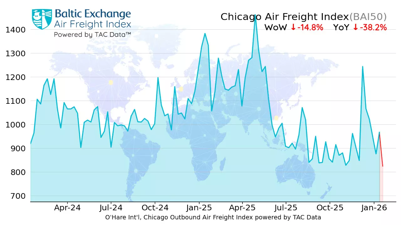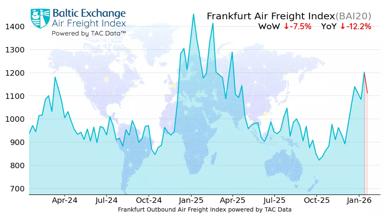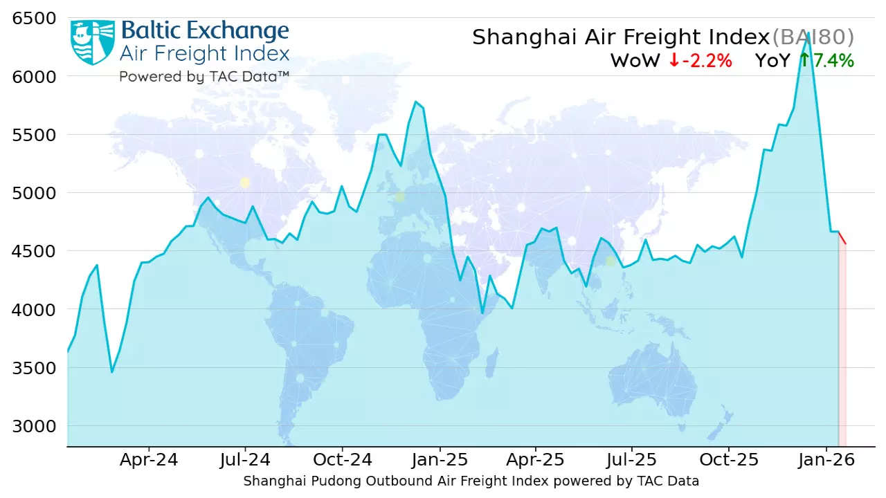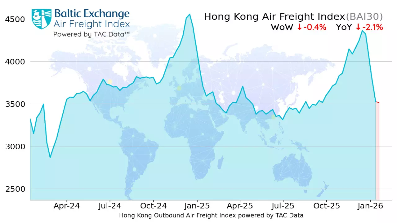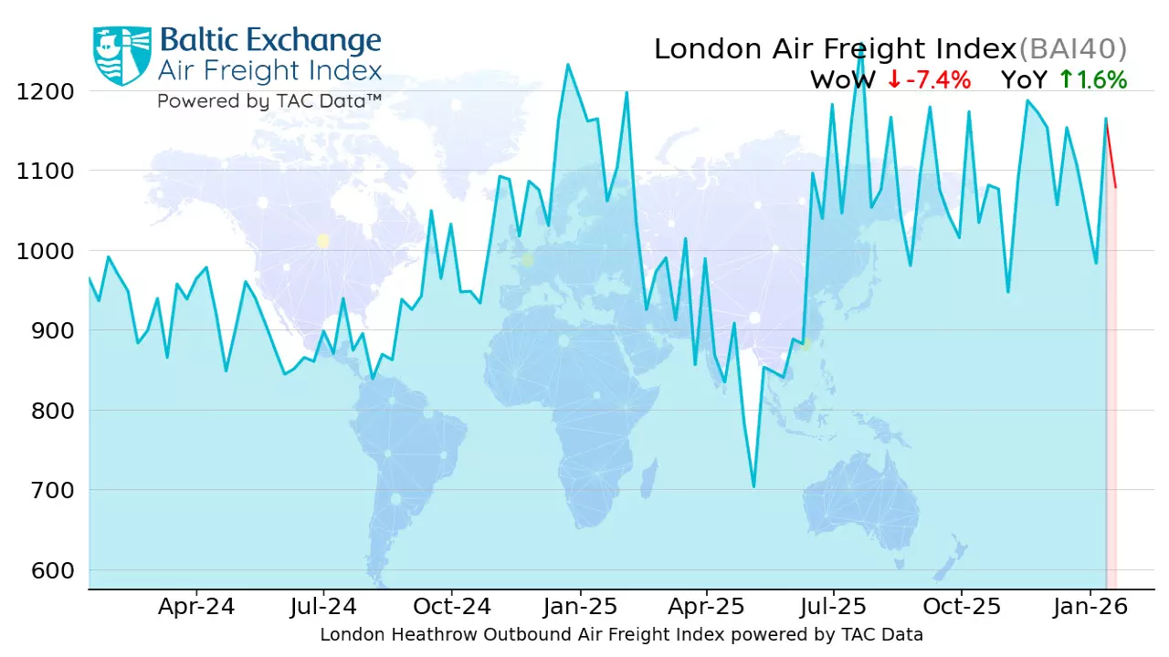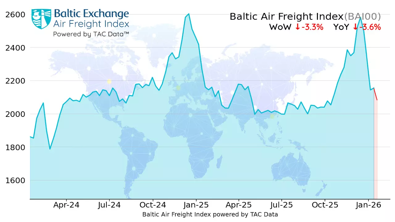 Global air freight rates edged slightly lower overall last week, according to the latest data from TAC Index, the leading price reporting agency for air freight markets. The global Baltic Air Freight Index (BAI00), calculated by TAC, fell by 3.3% in the week to 19 January, leaving it down by just 3.6% compared with the same period a year earlier.