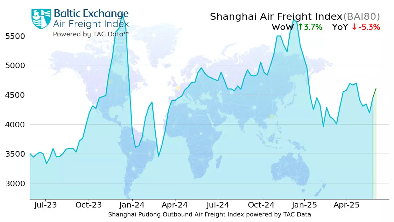 "The global Baltic Air Freight Index calculated by TAC was up +0.4 percent, leaving it lower by only -5.4 percent from 12 months ago when the market was being driven upwards by e-commerce activity."