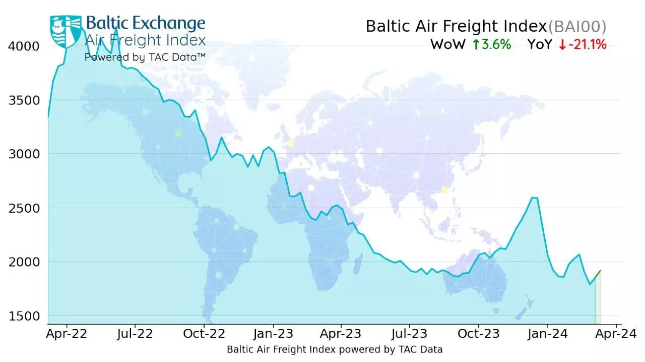 "The overall Baltic Air Freight Index calculated by TAC rose for a second successive week by 3.6 percent in the week to March 11 – to leave it lower by only 21.1 percent over 12 months."