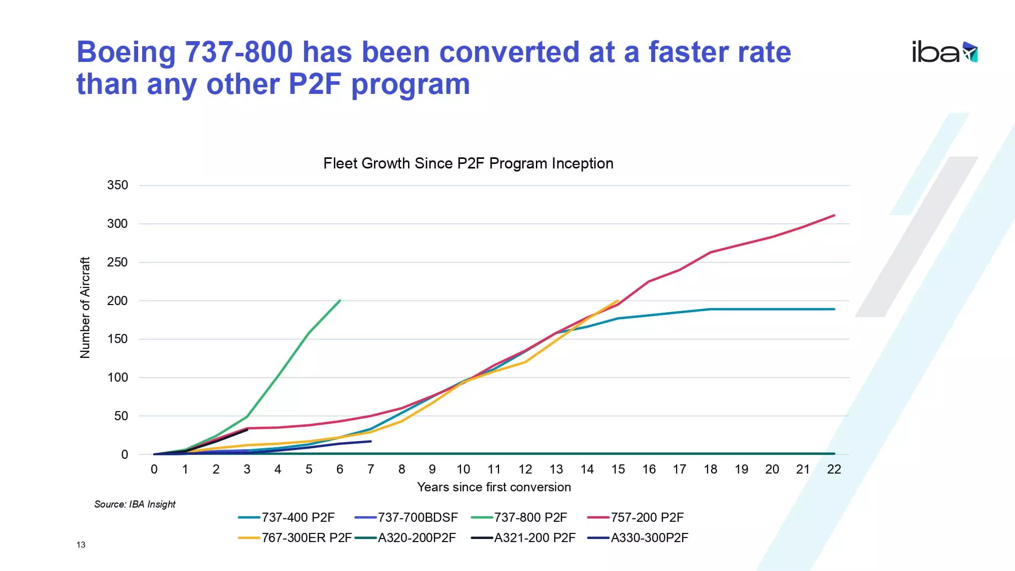 IBA has highlighted data from its aviation intelligence platform IBA Insight, which shows that the 737-800 has been converted at a faster rate than any other P2F programme. In the six years since the first conversions, the 737-800 P2F has grown rapidly to 200 aircraft. Comparatively, it took the 757-200 P2F and 767-300ER P2F fleets 15 years to reach this size.