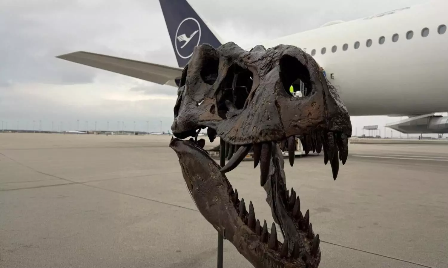 The transport required coordination between logistics partners and museum teams. A replica of a T-Rex head was displayed during handling to illustrate the contents of the shipment. Ground and flight crews observed the cargo during loading operations at the airport.