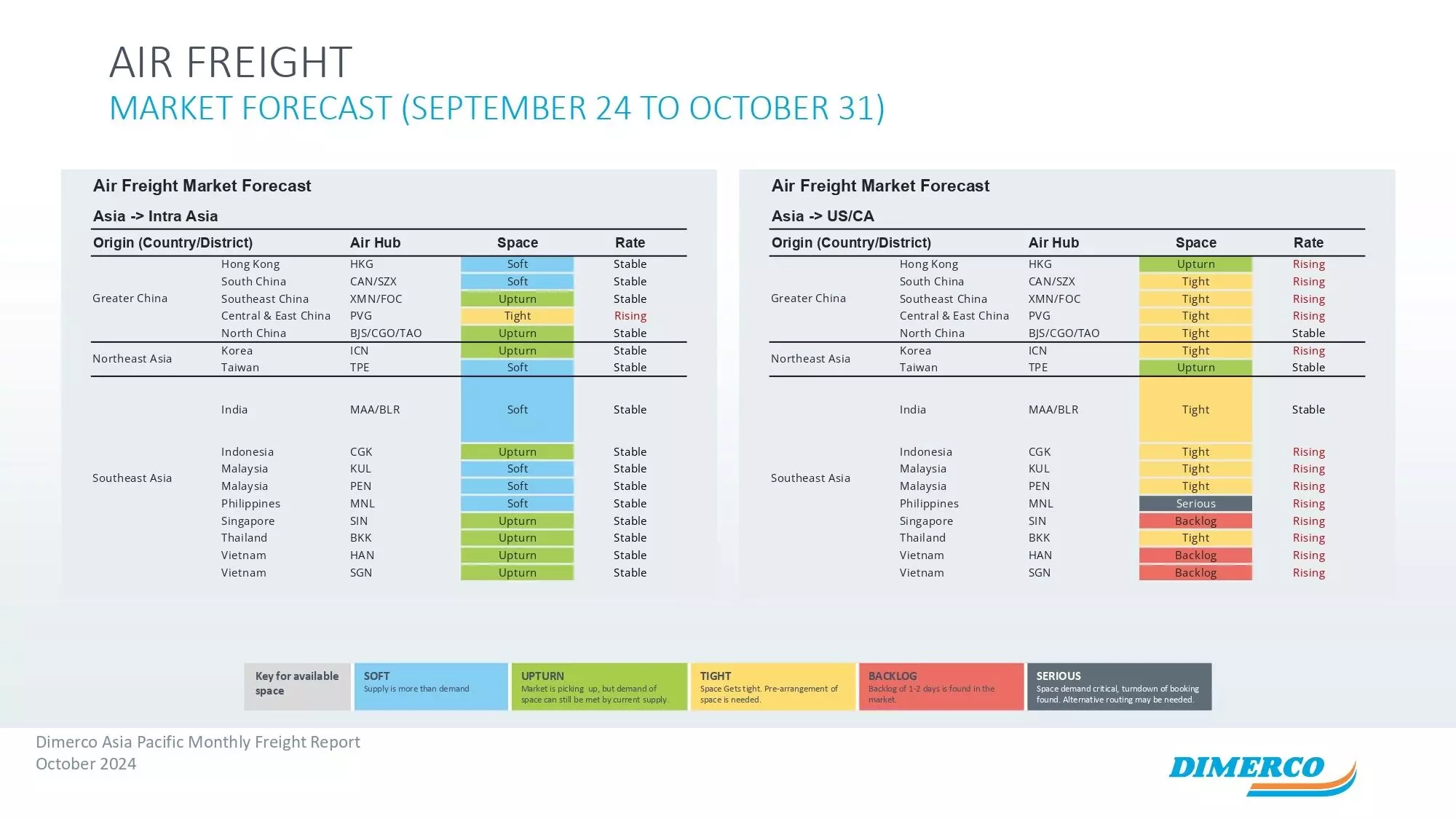 Kathy Liu, VP, Global Sales and Marketing, Dimerco Express Group says: "E-commerce and electronics volumes underperformed expectations in September but a surge is anticipated from late September into October with high demand likely starting mid-October to prepare for traditional online shopping festivals. The potential International Longshoremen's Association (ILA) strike on October 1 is expected to further boost air freight demand, particularly for shipments to the East Coast, as ocean freight switches to air. Globally, intra-Asia capacity will tighten, with long-haul routes prioritised during the peak season."