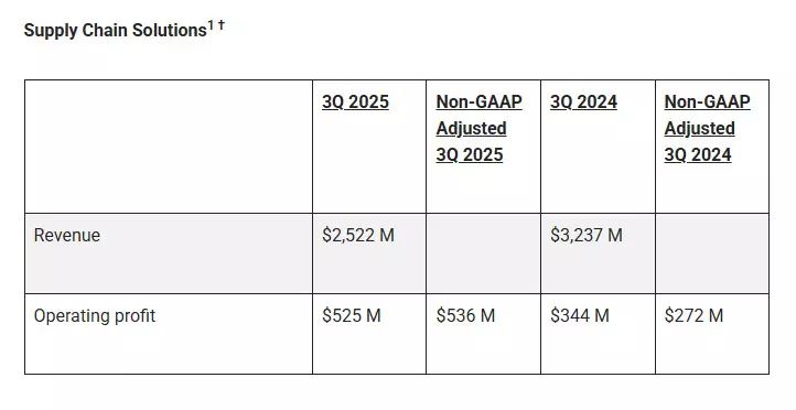 Supply Chain Solutions recorded $2.52 billion in revenue, down 22.1% primarily due to the divestiture of Coyote in 2024. The segment posted an operating profit of $525 million, with an adjusted margin of 21.3%.