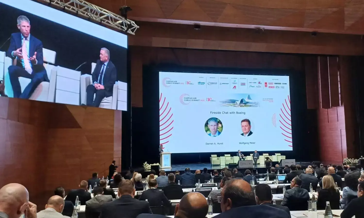 Darren Hulst of Boeing speaking during a fireside chat with Silk Way West Airlines' Wolfgang Meier and The Wicks Group's Glenn Wicksat at Caspian Air Cargo Summit.
