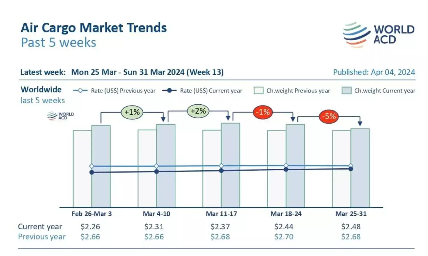 Average rates rose, week on week (WoW), by around two percent in week 13 (March 25-31) to $2.48 per kilo, following consecutive weekly WoW rises of between two percent and three percent last month, on a globalised basis, narrowing the gap between rates this year and the equivalent periods last year. "Average rates in January and February were 19 percent below their equivalent levels in 2023 but the gap narrowed throughout March from -15 percent in week nine to just -seven percent in week 13 based on the more than 450,000 weekly transactions covered by WorldACD’s data."