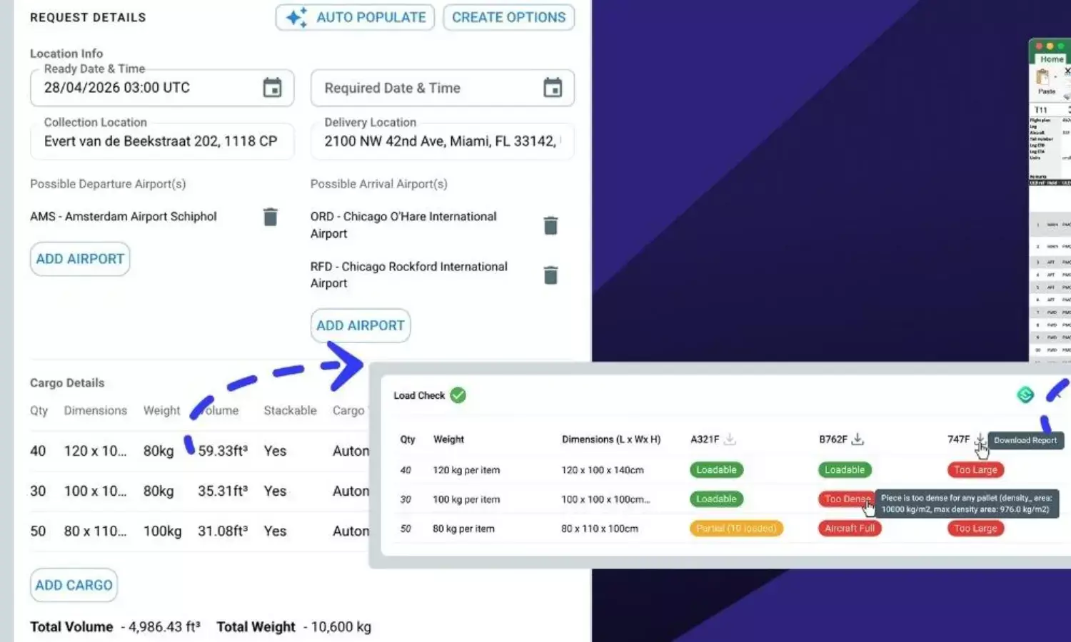 The integrated solution provides visibility on how many items of each cargo type can be loaded, flags size constraints, and identifies density or weight exceedances.