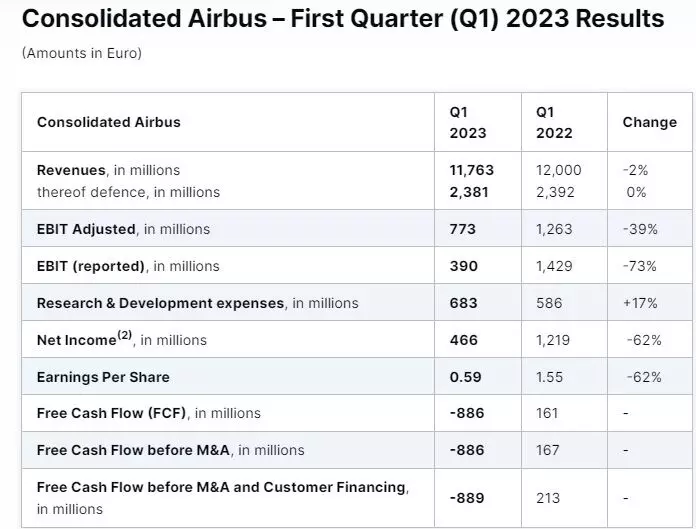 Airbus reported a marginal decline in consolidated revenue at €11.8 billion (Q1 2022: €12 billion) for the first quarter ended March 31, 2023 on deliveries of 127 commercial aircraft.