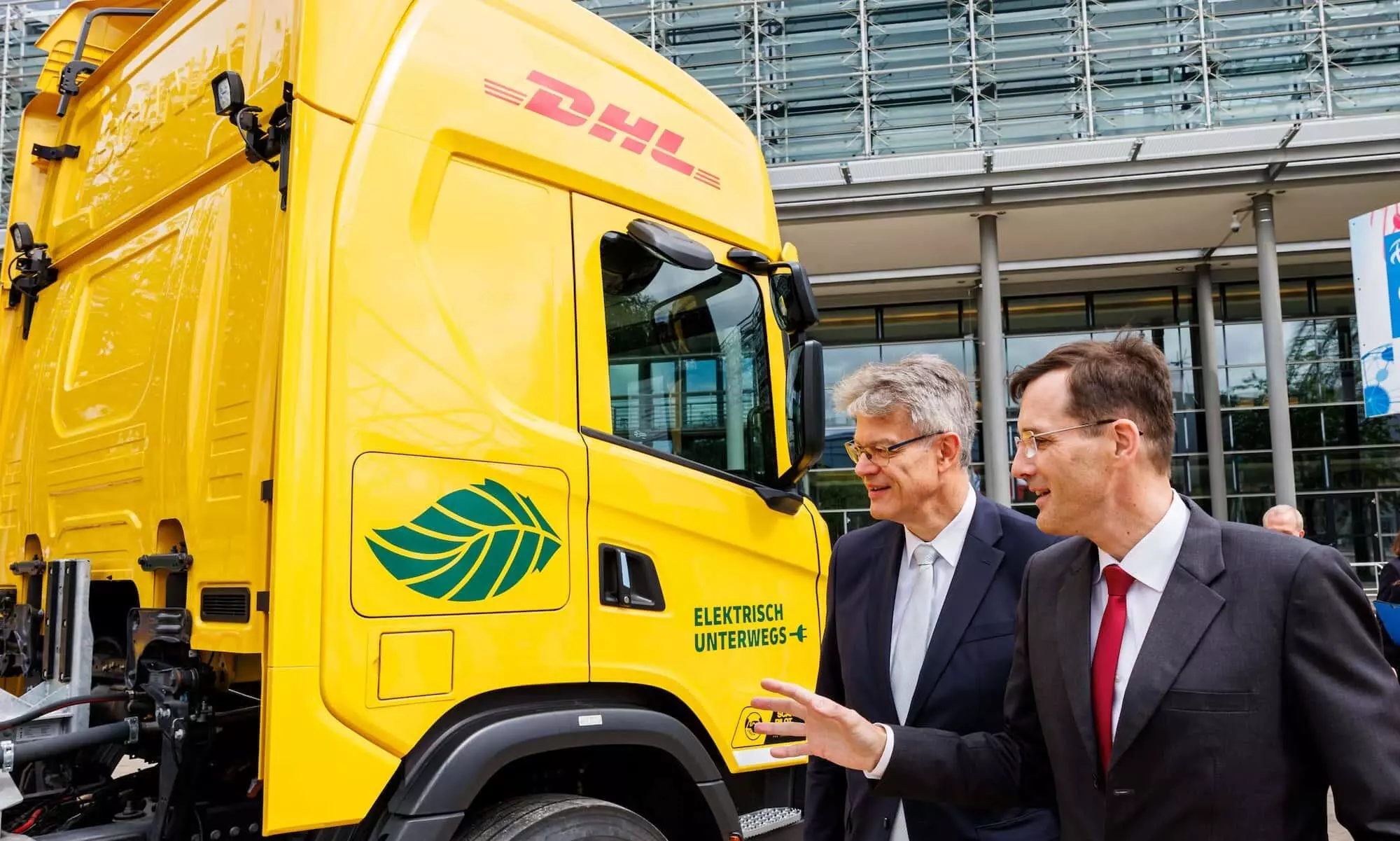 (From right): Tobias Meyer, CEO, DHL Group explains the new EREV truck from Scania to Federal Transport Minister Patrick Schnieder.